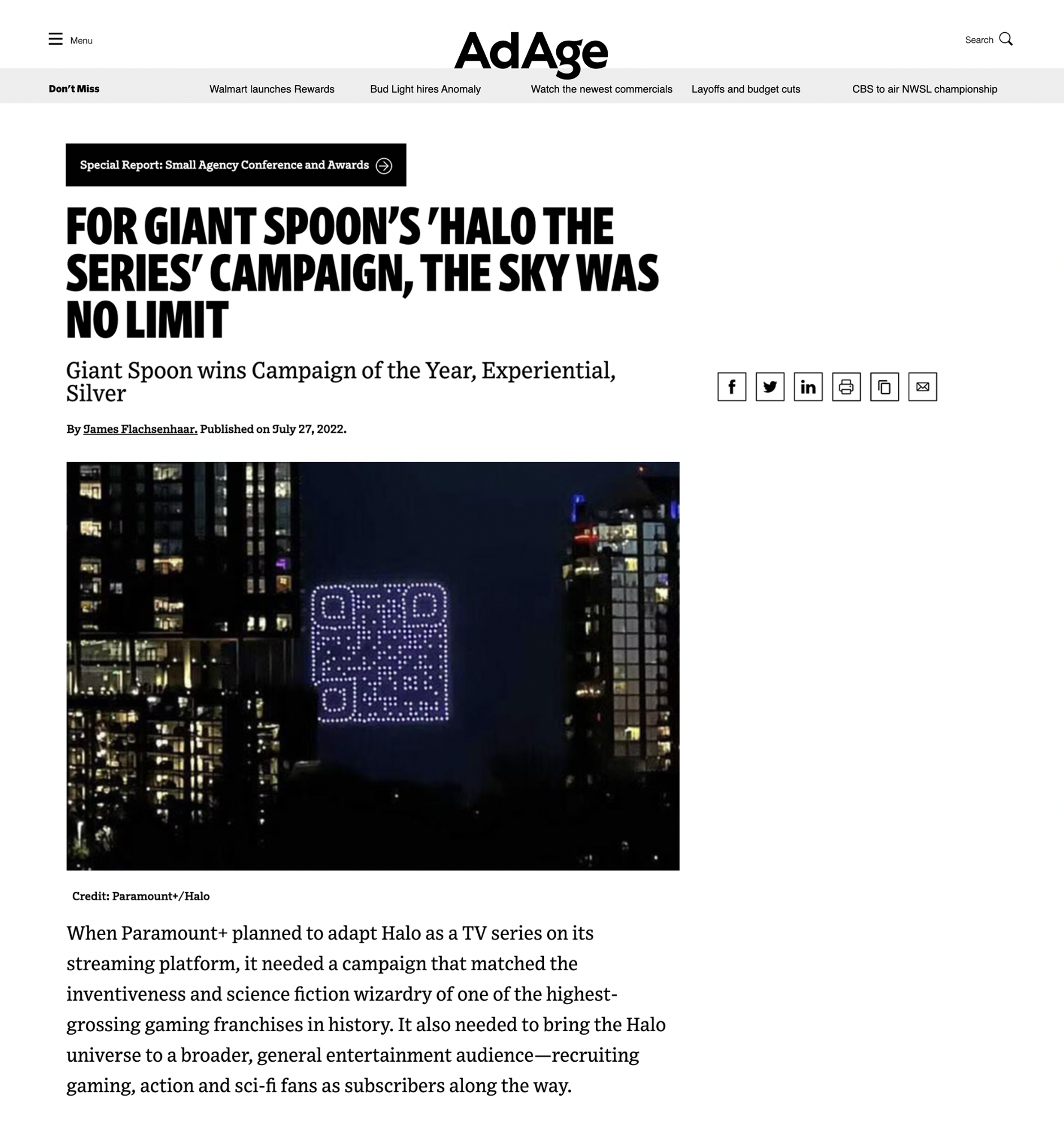 SXSW audiences are notoriously hard to impress so to launch Halo the Series for Paramount+, we aimed even higher than anyone expected — literally. We filled the Austin night sky with 400 synchronized drones, forming massive, iconic visuals from the Halo universe — 300 feet tall and 600 feet wide — culminating in a scannable, mile-wide QR code that dropped the latest trailer from above.